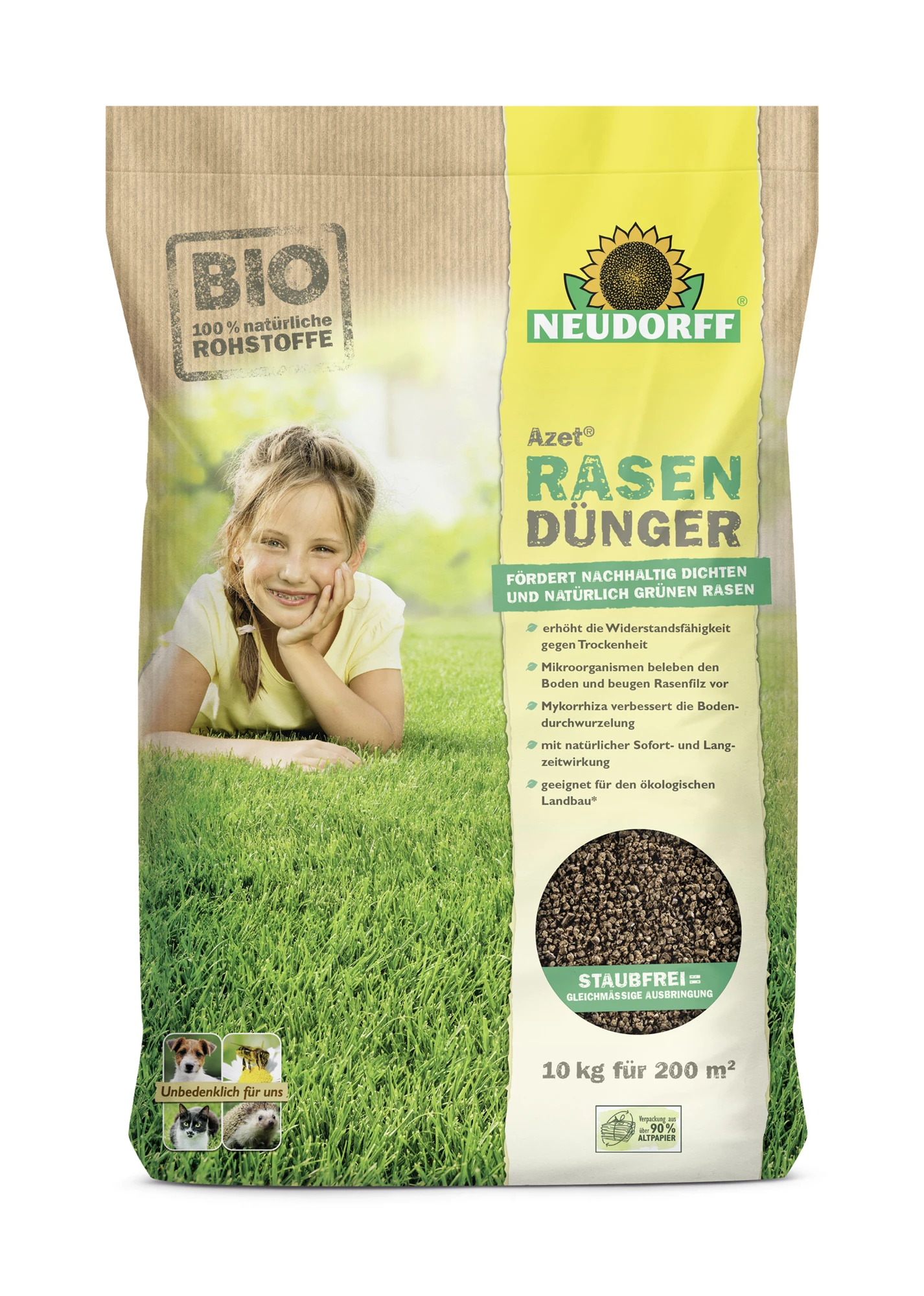 Organischer NPK-Dünger 9-3-5 mit natürlicher Sofort- und Langzeitwirkung. Für dichten und natürlich grünen Rasen, der Moos und Unkraut verdrängt. Mit bodenbelebenden Mikroorganismen und MyccoVital® (Mykorrhiza) für kräftige Wurzeln und eine optimale Widerstandskraft gegen Trockenheit. Aus natürlichen Rohstoffen. Schonend für Mensch und Tier.