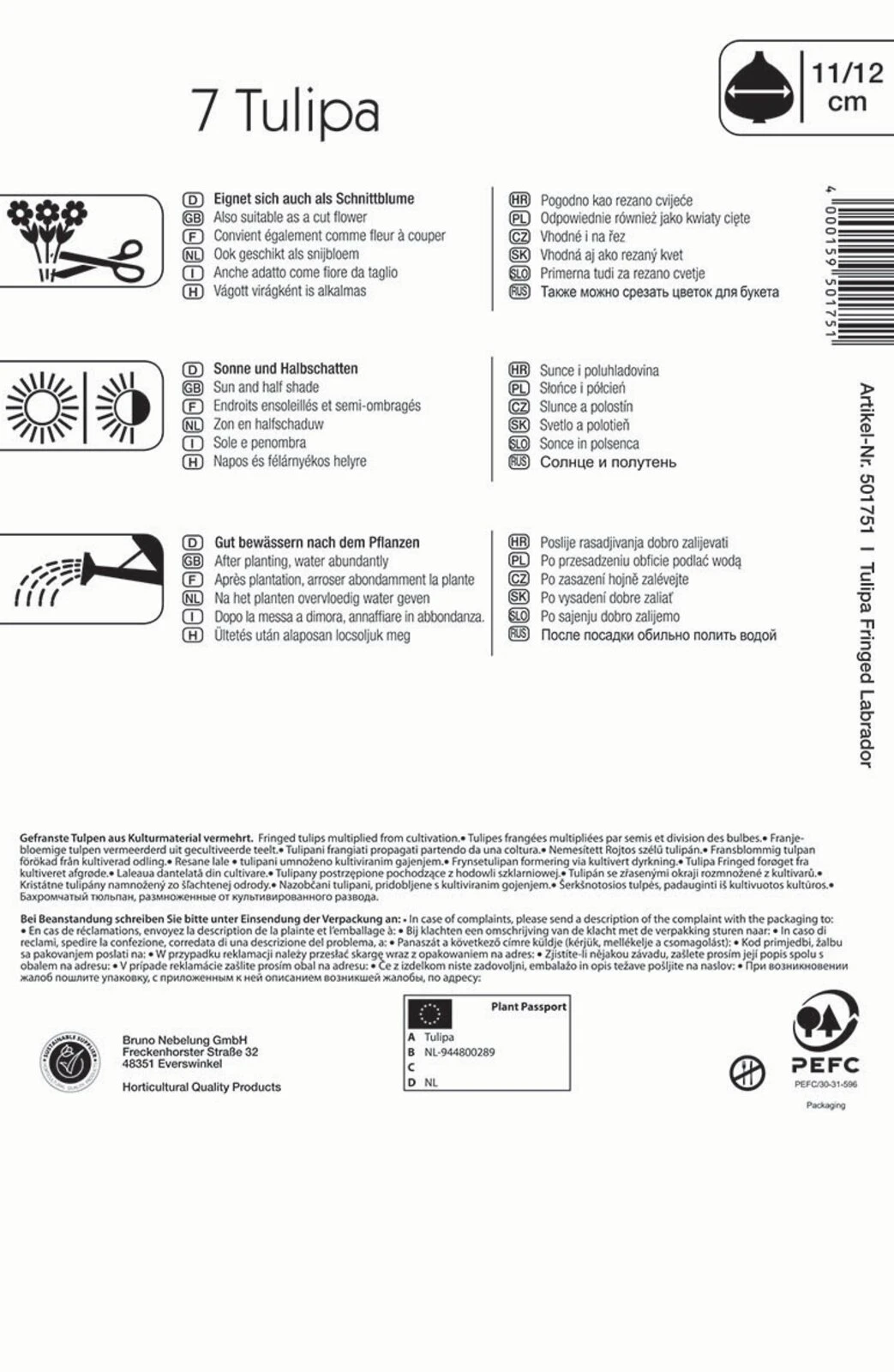 Die fast schwarze Crispa-Tulpe ‚Labrador‘ erweckt nicht nur durch ihre dunkle Farbe Aufmerksamkeit, sondern vor allem auch durch ihre stark gefransten Blütenblätter. Die zugleich mystisch und exotisch wirkenden Blüten sitzen auf ca. 45 cm hohen Stängeln. Ihre Blütezeit fällt in den April und Mai. ‚Labrador‘ bevorzugt im Gartenbeet halbschattige und sonnige Plätze. Sie ist zudem bestens als Schnittblume geeignet. Ausgezeichnet mit gelben, weißen oder rosa Farben zu kombinieren.