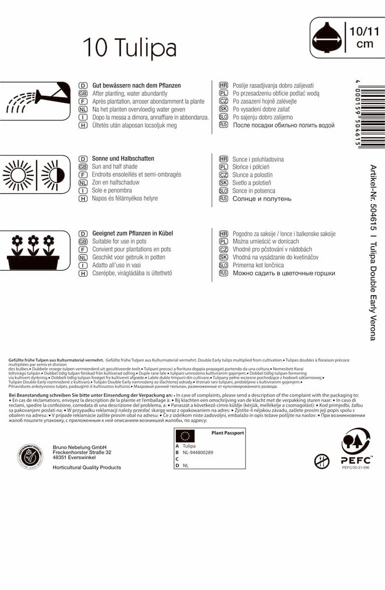 Die gefüllte, frühe Tulpe ‚Verona‘ verströmt einen ganz besonderen Charme: Sie ist prachtvoll, wächst sehr dicht und erreicht eine Höhe von 40 cm mit sehr starken Stielen. Sie eignet sich für die Pflanzung in Kübeln, Beeten und Balkonkästen. An einem sonnigen Standort strahlen ihre elfenbeinweißen bis hell-schwefelgelben Blüten besonders schön. Ab März zeigen sie sich zum ersten Mal und können von diesem Zeitpunkt an bewundert werden. Diese Profi-Line-Pflanze überzeugt mit herausragender Qualität.
